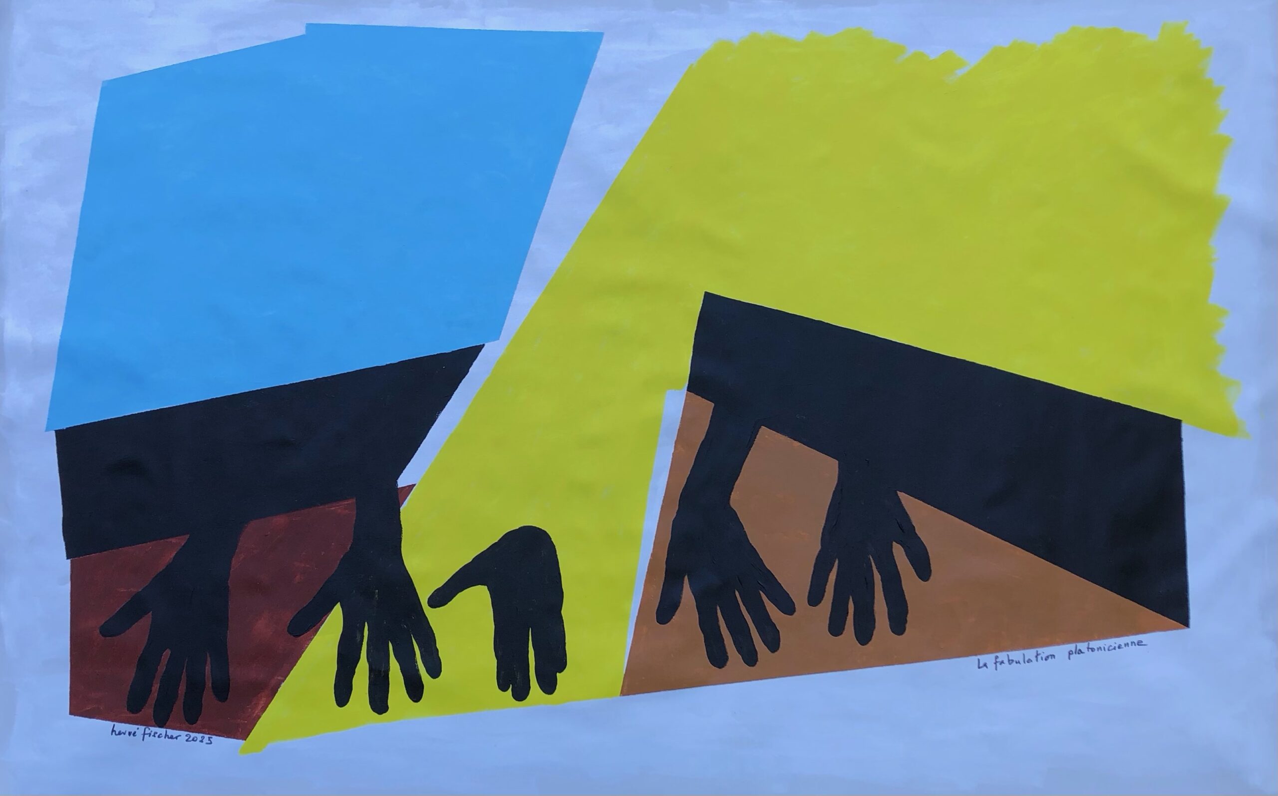 Cette toile presque abstraite évoque le mythe idéaliste de Platon et la caverne où il nous voit, piégés dans les ombres et les illusions – j’ajouterai comme des chauves-souris suspendues la tête en bas – aspirant au ciel des idées pures, les eidos, la réalité supérieure lumineuse que connaît le philosophe, le vrai, le beau, le bien.