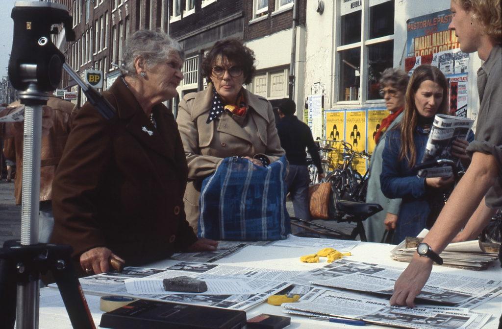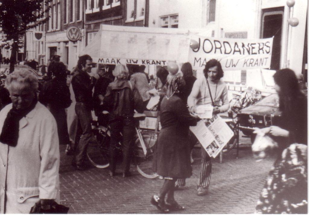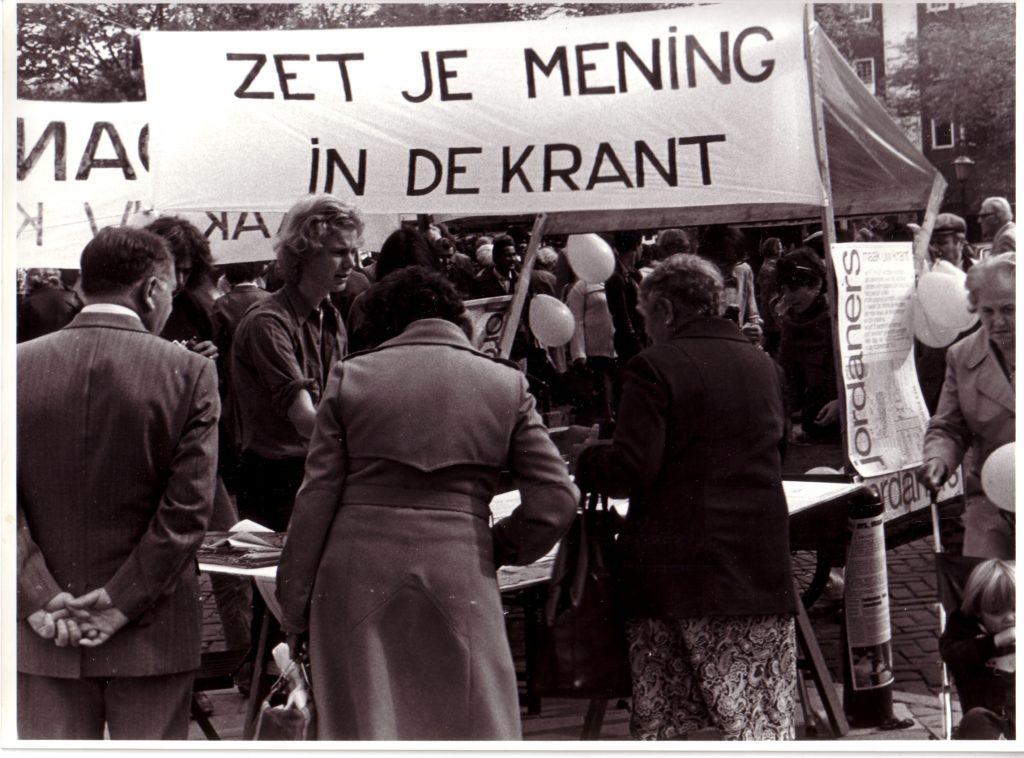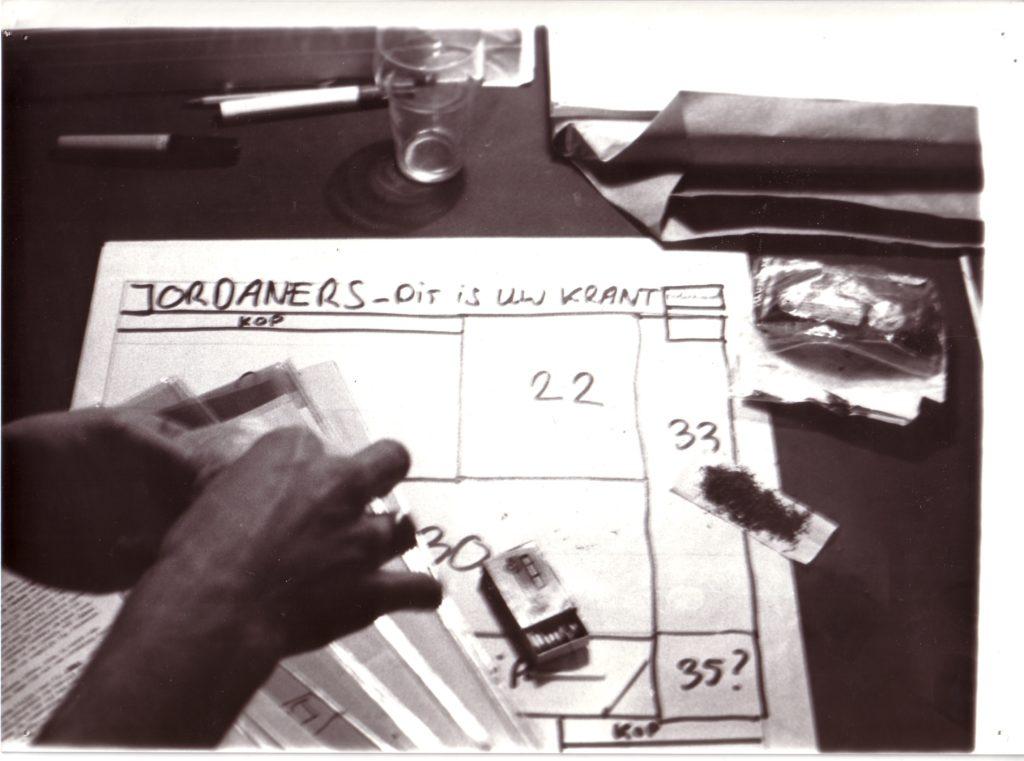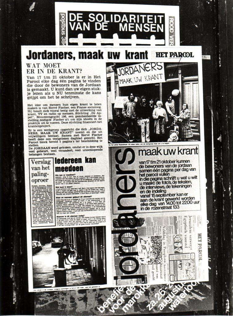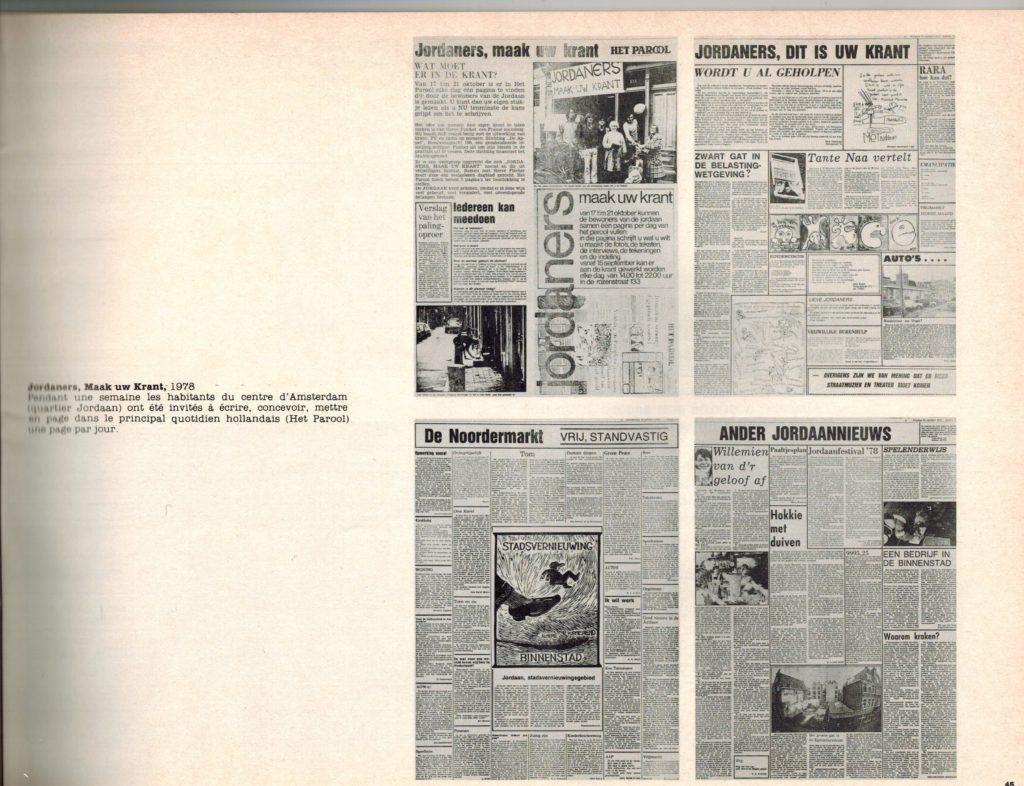 A Amsterdam, à l’invitation de la Fondation De Appel, j’ai travaillé sur une autre population, celle du quartier de Jordaan, qui est le quartier des canaux, jordaan signifiant « jardin » en hollandais. C’est donc un quartier très pittoresque mais qui a beaucoup de problèmes parce que les gens ne peuvent plus y rester à cause de l’immobilier qui devient trop cher. Ce sont les riches qui viennent acheter les belles maisons au bord des canaux et les locaux sont obligés de partir. Alors je suis allé voir, comme je l’ai souvent fait, le P.D.G. d’un grand quotidien – à Perpignan, c’était l‘Indépendant, et ici, ça a été Het Parool, qui veut dire « La Parole », le principal journal d’Amsterdam. J’ai demandé au P.D.G. de me donner gratuitement huit pages. Pourquoi ? Parce que je voulais que les habitants du quartier Jordaan écrivent eux-mêmes chaque jour pendant une semaine leur propre information, expliquent comment ils voyaient leur quartier, quels étaient leurs problèmes, leurs projets, leur contestation, etc. J’ai donc ouvert dans le quartier Jordaan une petite boutique qui est devenue le bureau du journal et, avec un collectif d’étudiants hollandais, on a fait la promotion du projet sur les places de marché, dans les rues. Les gens sont rapidement venus parler de leur quartier qu’ils aiment, se plaindre de l’hôtel de ville ou des impôts, du prix de l’immobilier, de ne plus pouvoir payer leurs loyers, etc. On réunissait les articles que les gens écrivaient, les photos qu’ils apportaient , puis ils revenaient à notre local pour choisir textes et illustrations sur le mur, rédiger les titres, faire la maquette de la page du journal. On allait au bureau de rédaction de Het Parool, le soir, et les professionnels du journal les aidaient à finir la page qui, le lendemain, était publiée.