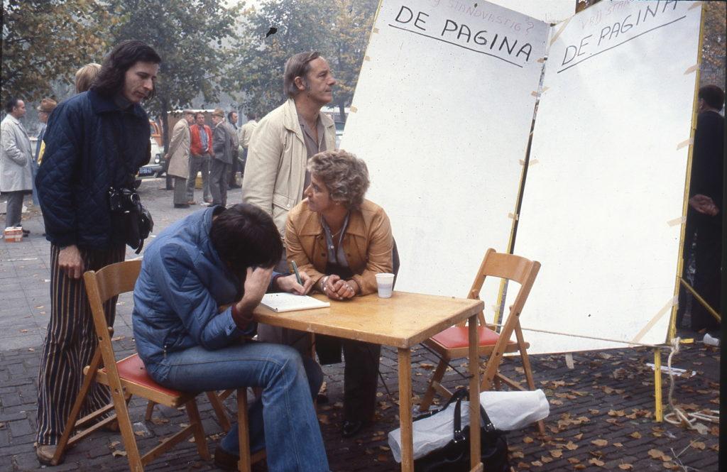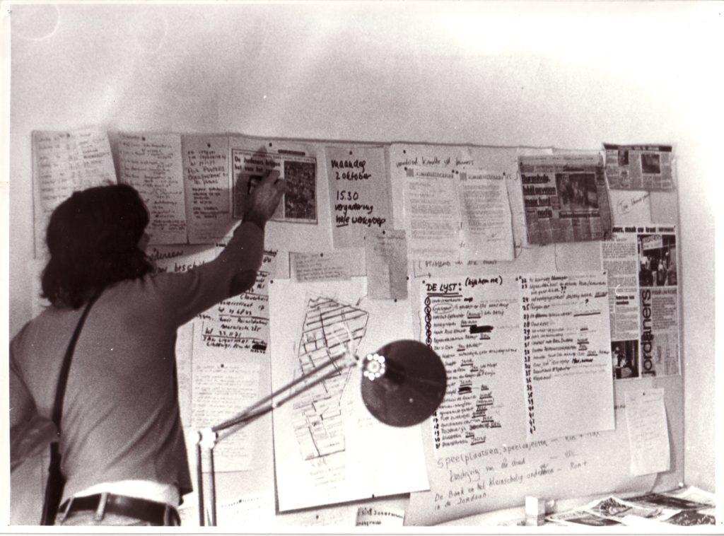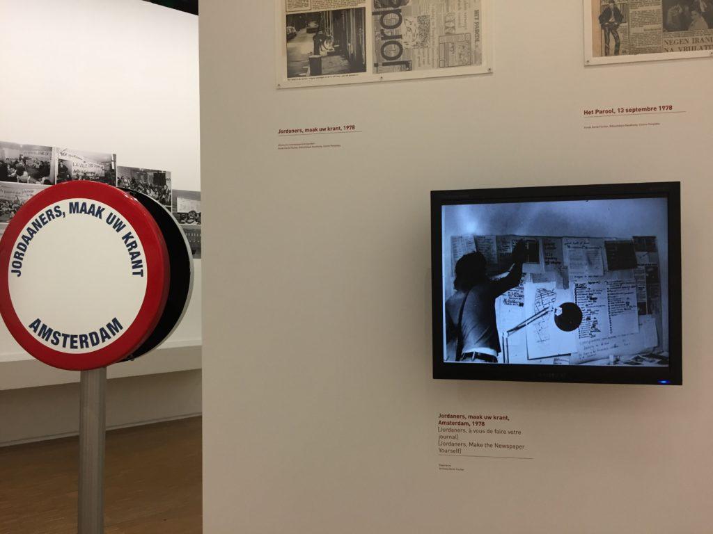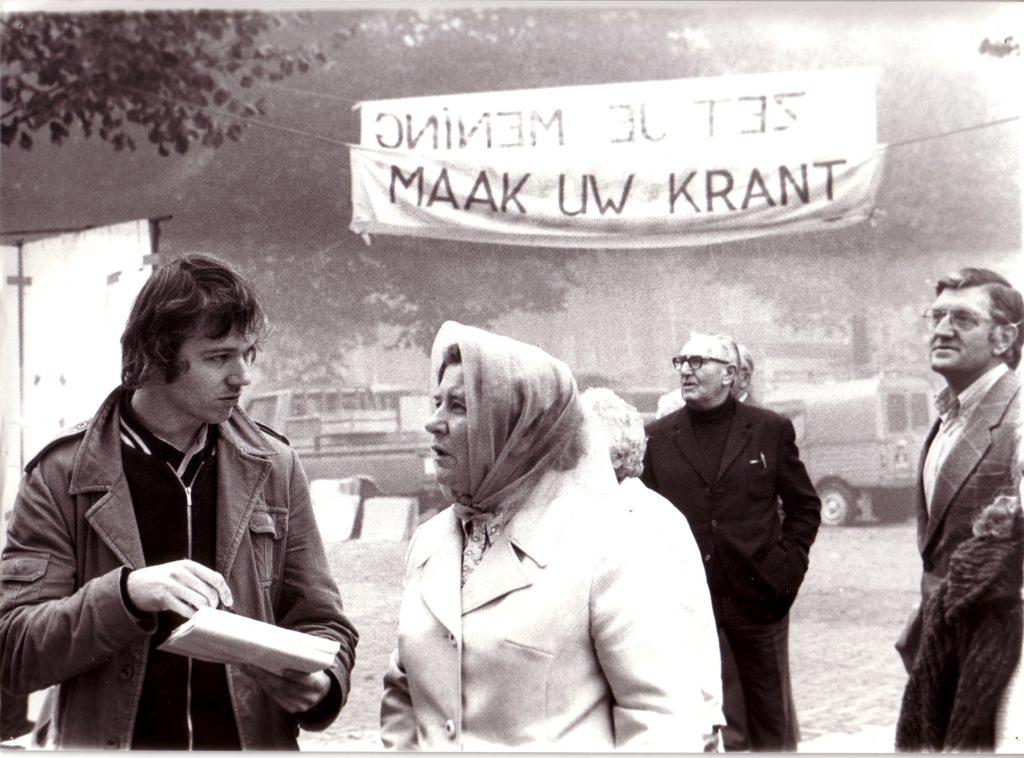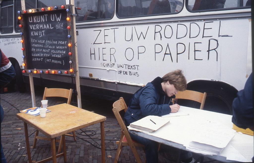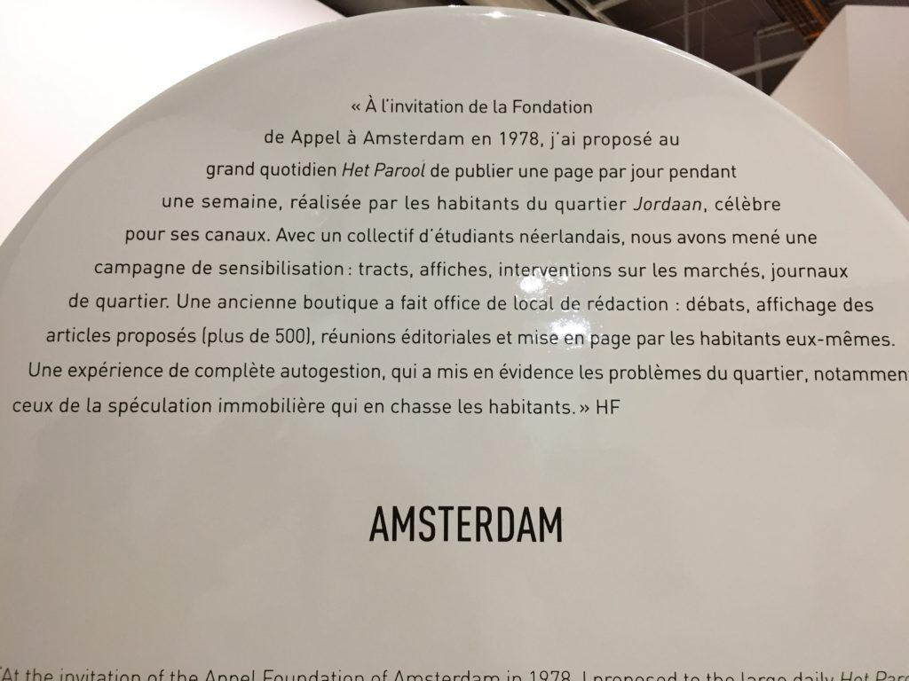A Amsterdam, à l’invitation de la Fondation De Appel, j’ai travaillé sur une autre population, celle du quartier de Jordaan, qui est le quartier des canaux, jordaan signifiant « jardin » en hollandais. C’est donc un quartier très pittoresque mais qui a beaucoup de problèmes parce que les gens ne peuvent plus y rester à cause de l’immobilier qui devient trop cher. Ce sont les riches qui viennent acheter les belles maisons au bord des canaux et les locaux sont obligés de partir. Alors je suis allé voir, comme je l’ai souvent fait, le P.D.G. d’un grand quotidien – à Perpignan, c’était l‘Indépendant, et ici, ça a été Het Parool, qui veut dire « La Parole », le principal journal d’Amsterdam. J’ai demandé au P.D.G. de me donner gratuitement huit pages. Pourquoi ? Parce que je voulais que les habitants du quartier Jordaan écrivent eux-mêmes chaque jour pendant une semaine leur propre information, expliquent comment ils voyaient leur quartier, quels étaient leurs problèmes, leurs projets, leur contestation, etc. J’ai donc ouvert dans le quartier Jordaan une petite boutique qui est devenue le bureau du journal et, avec un collectif d’étudiants hollandais, on a fait la promotion du projet sur les places de marché, dans les rues. Les gens sont rapidement venus parler de leur quartier qu’ils aiment, se plaindre de l’hôtel de ville ou des impôts, du prix de l’immobilier, de ne plus pouvoir payer leurs loyers, etc. On réunissait les articles que les gens écrivaient, les photos qu’ils apportaient , puis ils revenaient à notre local pour choisir textes et illustrations sur le mur, rédiger les titres, faire la maquette de la page du journal. On allait au bureau de rédaction de Het Parool, le soir, et les professionnels du journal les aidaient à finir la page qui, le lendemain, était publiée.