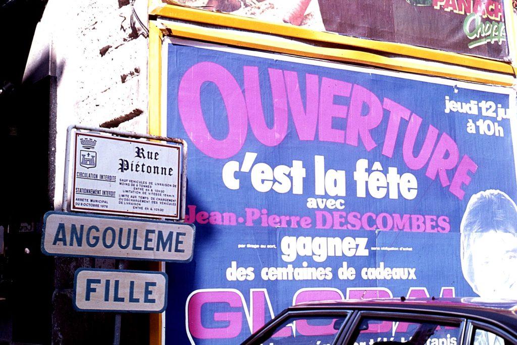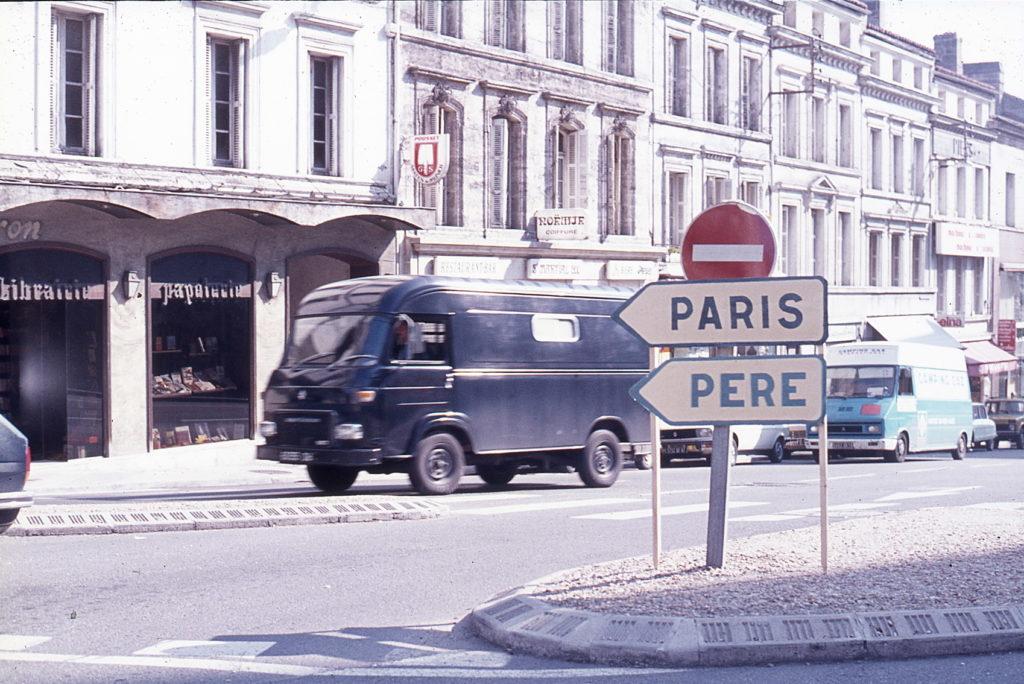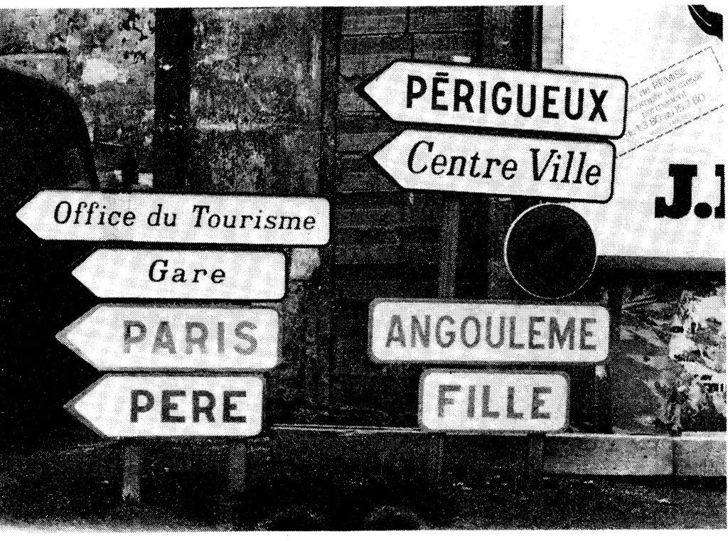 J’y mets en place une centaine de panneaux imités de ceux de la signalisation officielle, avec l’aide des étudiants de l’École des Beaux-arts d’Angoulême. J’exploite la symbolique sexuelle des panneaux, directionnels pour Paris et rectangulaires pour Angoulême. À tous les grands carrefours en bas de la ville, qui est bâtie sur une colline, nous plaçons des panneaux « Père » orientés vers le haut de la vieille ville, qui sont lus comme « Paris » par les chauffeurs de poids lourds venant du sud de la France et allant vers la capitale avec leurs cargaisons de fruits et légumes. Il en résulte rapidement un embouteillage monstre des poids lourds dans les rues étroites du centre ville. Nous avons placé aussi systématiquement des panneaux « Père » devant les bâtiments officiels (gare, palais de justice, poste, théâtre, bureau de tourisme, commissariat de police, etc.) Et les panneaux « Angoulême » sont doublés de panneaux « Filles ». Une distribution de cartes postales interrogatives, des entretiens avec les passants sur les rapports entre la province et la capitale complètent le dispositif. Bien sûr, les autorités de police, passée la surprise et tentant de rétablir l’ordre et la circulation, réagissent mal à ce « parcours poétique ». Nous les croisons bientôt. Ils ont autant de panneaux sous les bras que nous… Tout se termine dans le bureau du préfet, encadré d’hommes galonnés, qui a mis sur sa table une pile d’articles de la constitution, du code civil, des règlements municipaux, etc., qui ont été enfreints – une colonne d’au moins soixante centimètres de haut ! Plus haute que sa tête, sur la table où il est assis pour me recevoir, c’est ce que je remarque tout de suite en entrant.