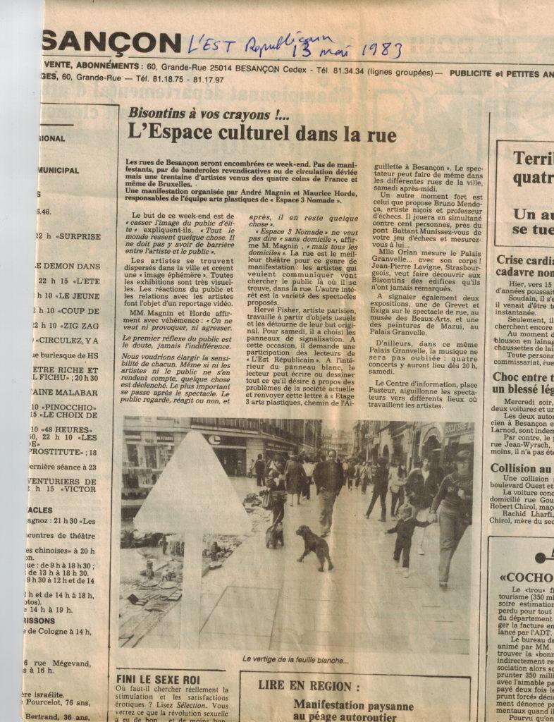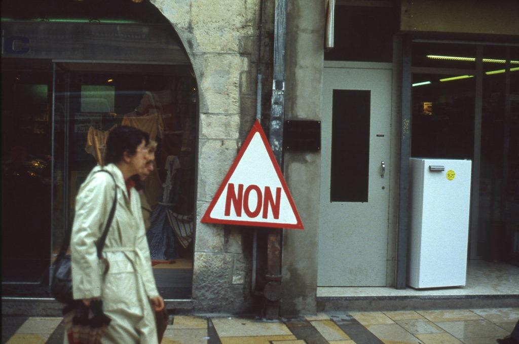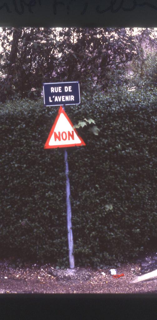 À Besançon, dans la banlieue de Saint-Étienne, dans le village de Chardonnes, à Mexico, chaque fois en fonction des contextes politiques, sociaux, culturels j’ai recouru à ces signalisations imaginaires, avec des interventions, des enquêtes, parfois brèves, parfois de plusieurs mois, en liaison avec des colloques, des expositions dans des musées jusqu’en 1984.