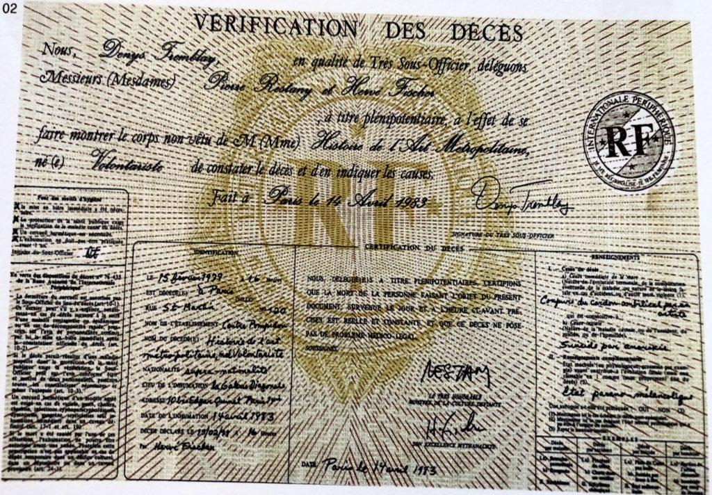 Certificat de décès révélant les circonstances de la mort de l’Histoire de l’art métropolitaine