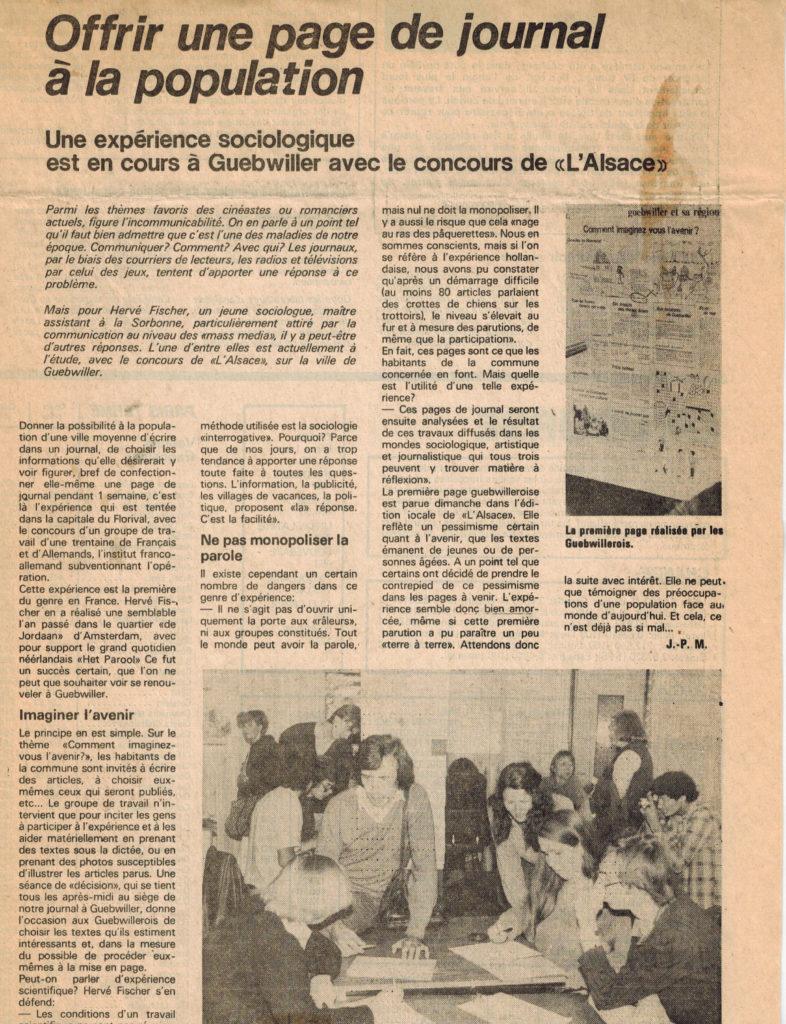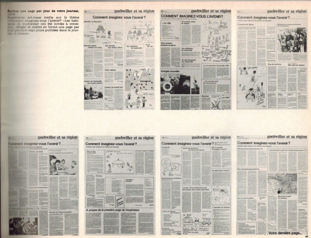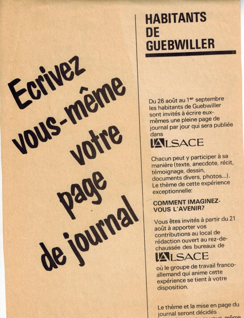 Opération comparable à celle d’Amsterdam, mais cette fois dans l’ensemble d’une ville, plus petite, Guebwiller (12.000 habitants). Un thème est proposé « Comment imaginez-vous l’avenir ? » Le principal quotidien régional, L’Alsace, donne son accord pour publier une page par jour pendant une semaine. Une 7ème page sera même publiée, en raison du succès de l’expérience. Parution dans les deux éditions, la française et l’allemande. Les débats publics, entrevues, les articles écrits par les habitants de Guebwiller reflètent notamment de graves conflits générationnels, des difficultés économiques et sociales et expriment un pessimisme dominant face à l’avenir. L’expérience est réalisée avec un groupe de jeunes et soutenue par l’Office franco-allemand pour la jeunesse.