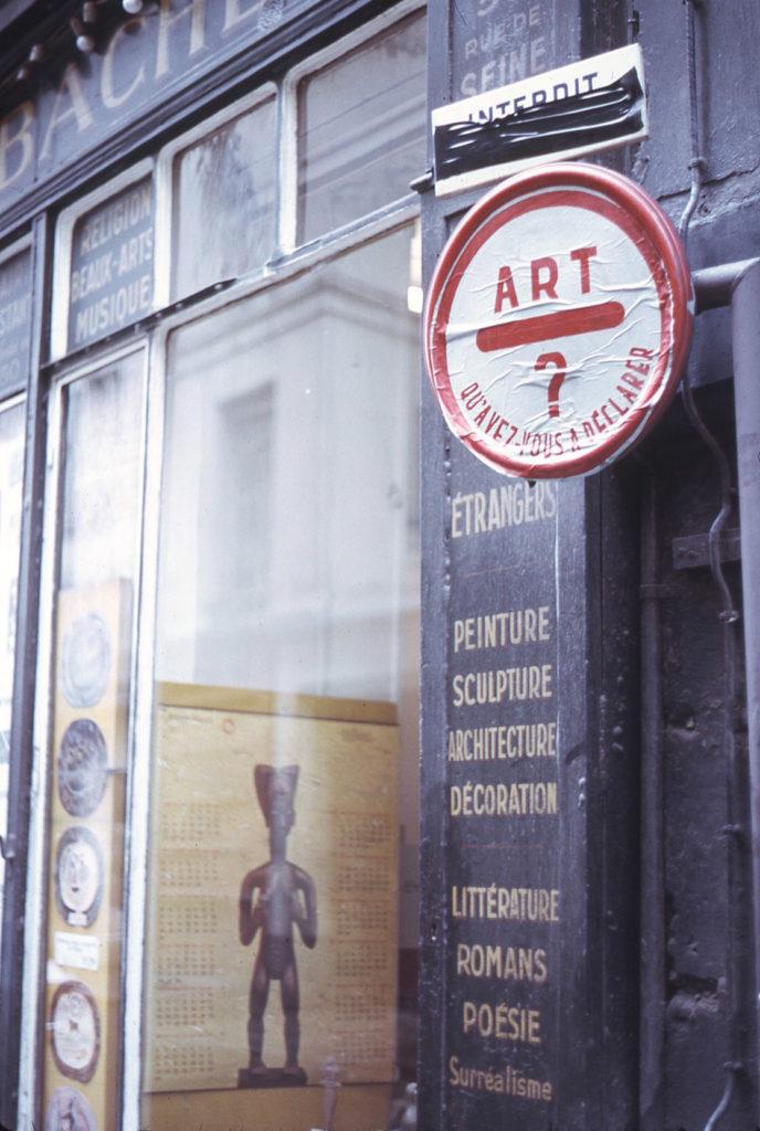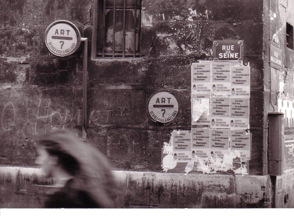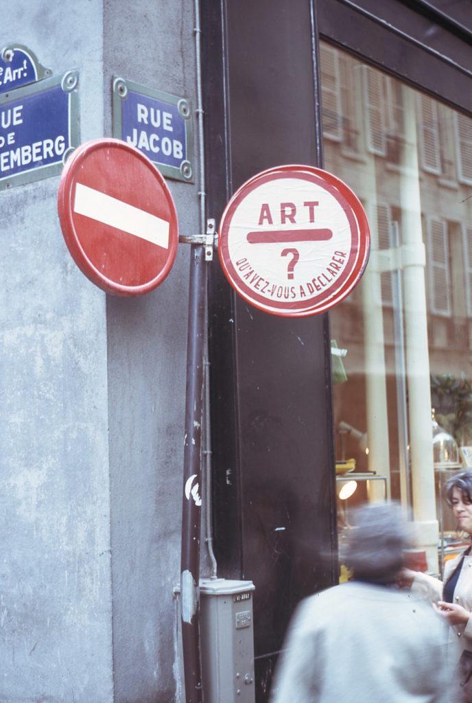 J’ai donc recouvert les panneaux de circulation routière et d’interdiction de stationner de ronds de papier collé avec cette même question de douane artistique qui s’adressait directement aux passants et visiteurs de ce quartier de galeries d’art de Saint-Germain-des- Prés, où j’allais moi-même souvent visiter les expositions. Il y en avait une cinquantaine. Ils y restèrent -sans doute la colle était-elle bonne, et la question aussi – les trois mois de l’été 1974.